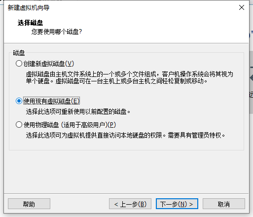 来到选择磁盘界面,选择使用现有虚拟磁盘。