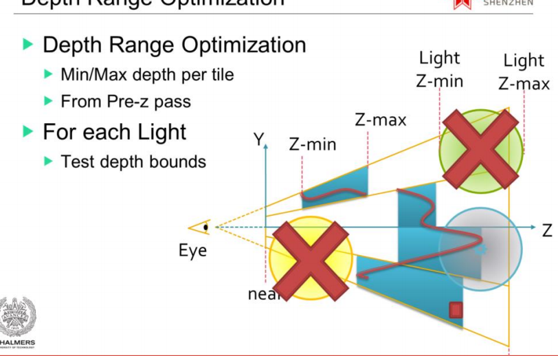 图形渲染工程师们为了解决 tiled based 的 Depth Discontinuity(深度不连续性), 改进 原始的 DepthBounds 提出了部分算法,比如 ”Modified HalfZ“ 引入在原有的Zmax和Zmin进行计算中间多层Z,再进行光源的剔除,一定程度上缓解了 ”Depth Discontinuity“现象