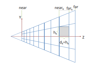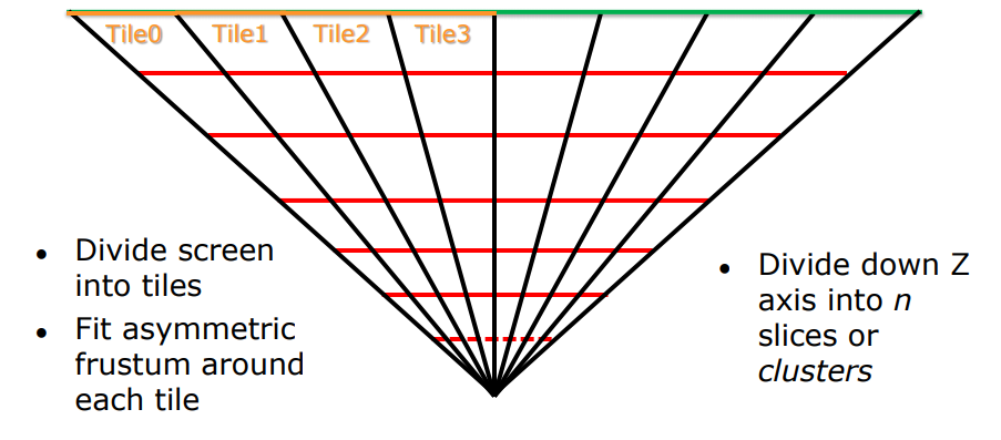 cluster based(分簇) 剔除光源就是引入Z划分的概念,将整个视截体从X,Y,Z方向进行切分, 分成一个个小视截体,如下所示,这里的Z划分固定的,根据FarPlane和NearPlane进行划分,并不依赖PreZ的值.