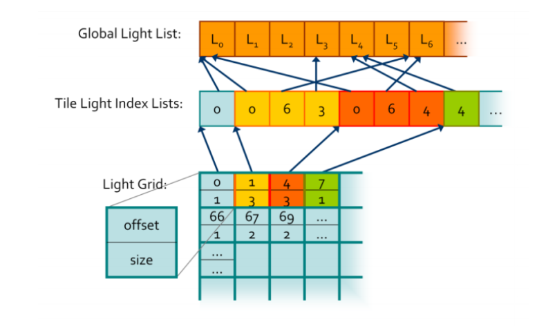 这里为了简化数据结构, 全局索引偏移表和全局光源索引表 都是一维数组, 全局索引偏移表元素记录了每个cluster的的光源数量和每个cluster的的光源在全局光源索引表的Index偏移.