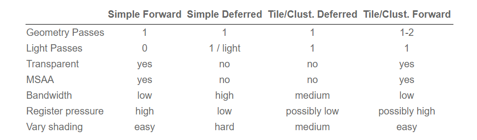 下面的 ”no“并非代表不能, 而是代表 ”困难性能消耗比常规大的意思“, 从这两三年的发展来看,总体上 ClusterBasedForwardRender 是业界的未来,综合的优点太诱人了。