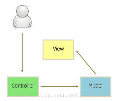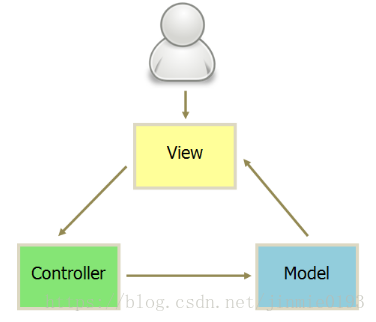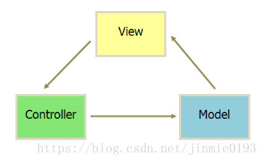 工作原理:当用户出发事件的时候,view层会发送指令到controller层,接着controller去通知model层更新数据,model层更新完数据以后直接显示在view层上
