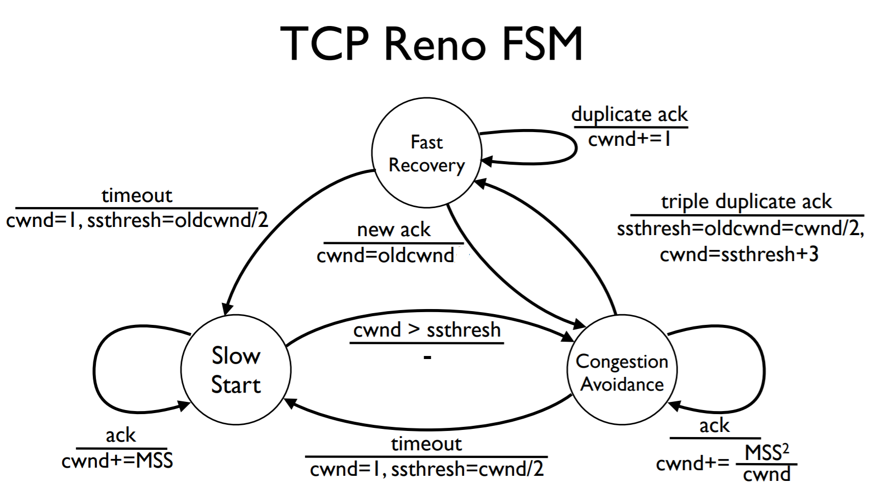 TCP经历了Tahoe版本之后,出现了一个新版本 Reno 。这个版本对Tahoe进行了改进,如果从有限状态机的角度看,Tahoe有两个状态,Reno有三个状态: