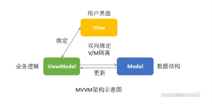 Model和View并无直接关联,而是通过ViewModel来进行联系的,Model和ViewModel之间有着双向数据绑定的联系。因此当Model中的数据改变时会触发View层的刷新,View中由于用户交互操作而改变的数据也会在Model中同步。