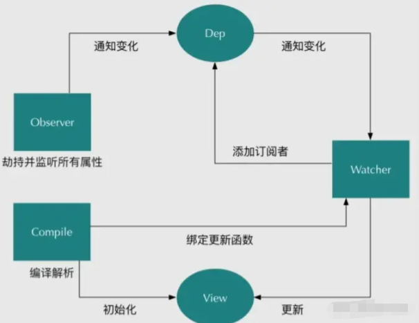 4.MVVM作为数据绑定的入口,整合Observer、Compile和Watcher三者,通过Observer来监听自己的model数据变化,通过Compile来解析编译模板指令,最终利用Watcher搭起Observer和Compile之间的通信桥梁,达到数据变化 -> 视图更新;视图交互变化(input) -> 数据model变更的双向绑定效果。