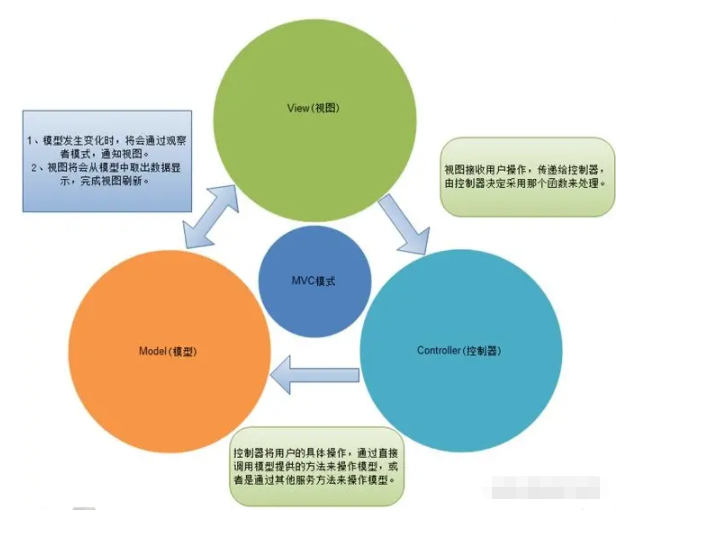 MVC 通过分离 Model、View 和 Controller 的方式来组织代码结构。其中 View 负责页面的显示逻辑,Model 负责存储页面的业务数据,以及对相应数据的操作。并且 View 和 Model 应用了观察者模式,当 Model 层发生改变的时候它会通知有关 View 层更新页面。Controller 层是 View 层和 Model 层的纽带,它主要负责用户与应用的响应操作,当用户与页面产生交互的时候,Controller 中的事件触发器就开始工作了,通过调用 Model 层,来完成对 Model 的修改,然后 Model 层再去通知View视图更新。