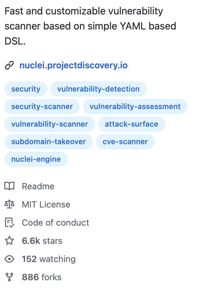 Nuclei是一款基于YAML语法模板的开发的定制化快速漏洞扫描器。它使用Go语言开发,具有很强的可配置性、可扩展性和易用性。 目前该项目在Github上已经有6.6k个stars。 小知识: YAML(/ˈjæməl/,尾音类似camel骆驼)是一个可读性高,用来表达数据序列化的格式。YAML参考了其他多种语言,包括:C语言、Python、Perl,并从XML、电子邮件的数据格式(RFC 2822)中获得灵感。Clark Evans在2001年首次发表了这种语言,另外Ingy döt Net与Oren Ben-Kiki也是这语言的共同设计者。当前已经有数种编程语言或脚本语言支持(或者说解析)这种语言。 YAML是"YAML Ain't a Markup Language"(YAML不是一种标记语言)的递归缩写。在开发的这种语言时,YAML 的意思其实是:"Yet Another Markup Language"(仍是一种标记语言),但为了强调这种语言以数据做为中心,而不是以标记语言为重点,而用反向缩略语重命名。 由于Nuclei需要最新的go才能安装,安装之前需要先使用以下命令安装Go语言:一、工具简介