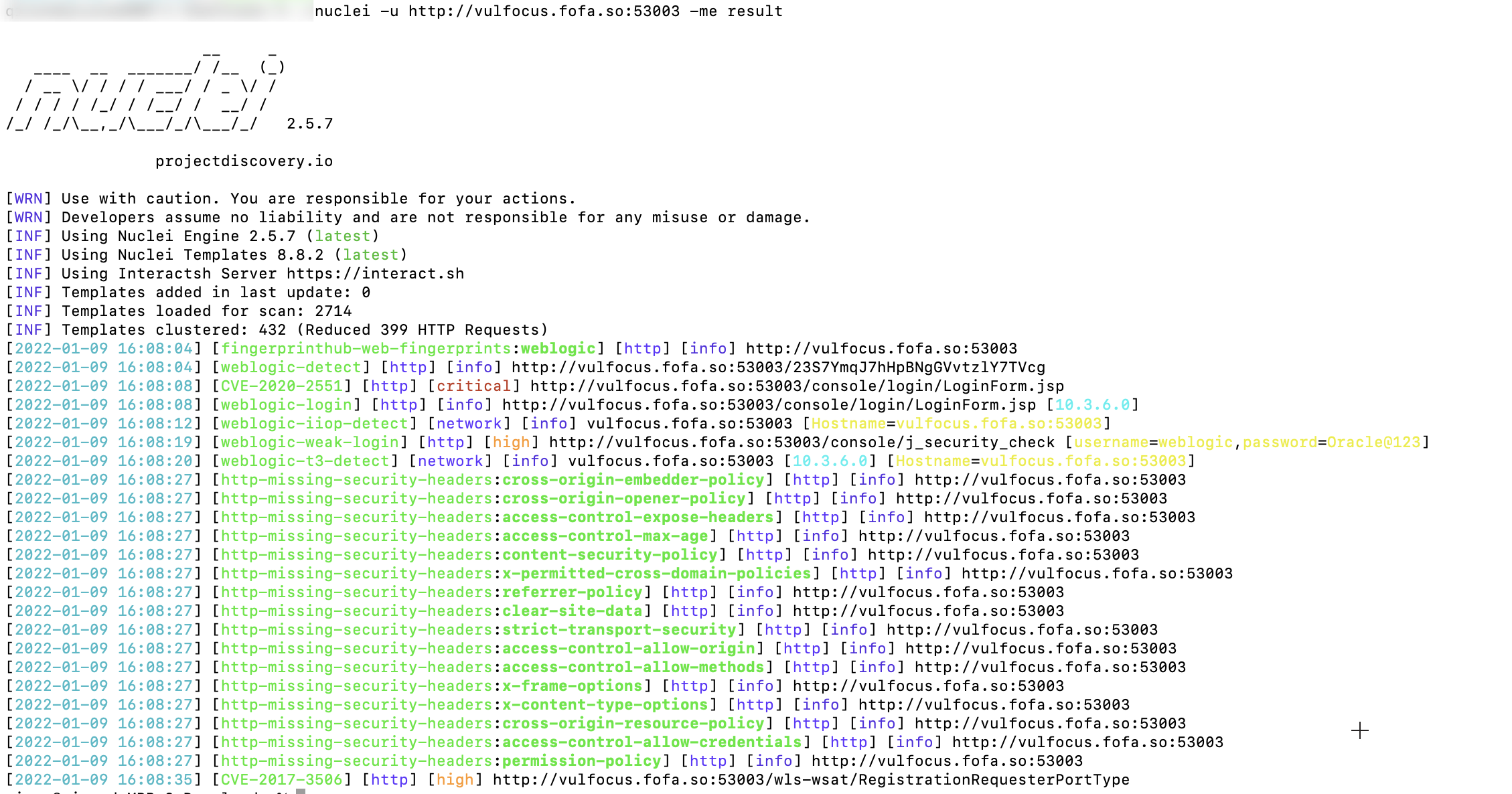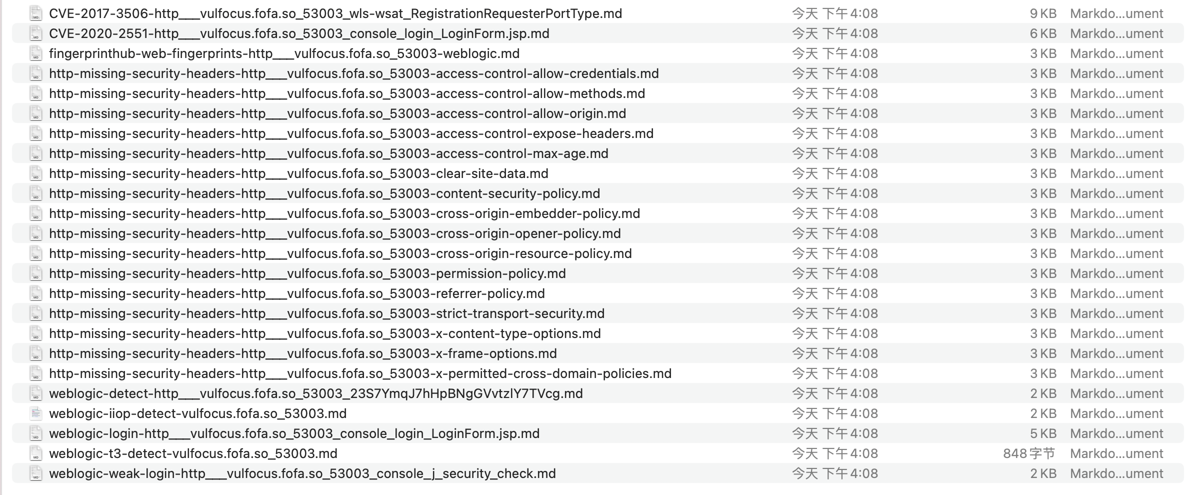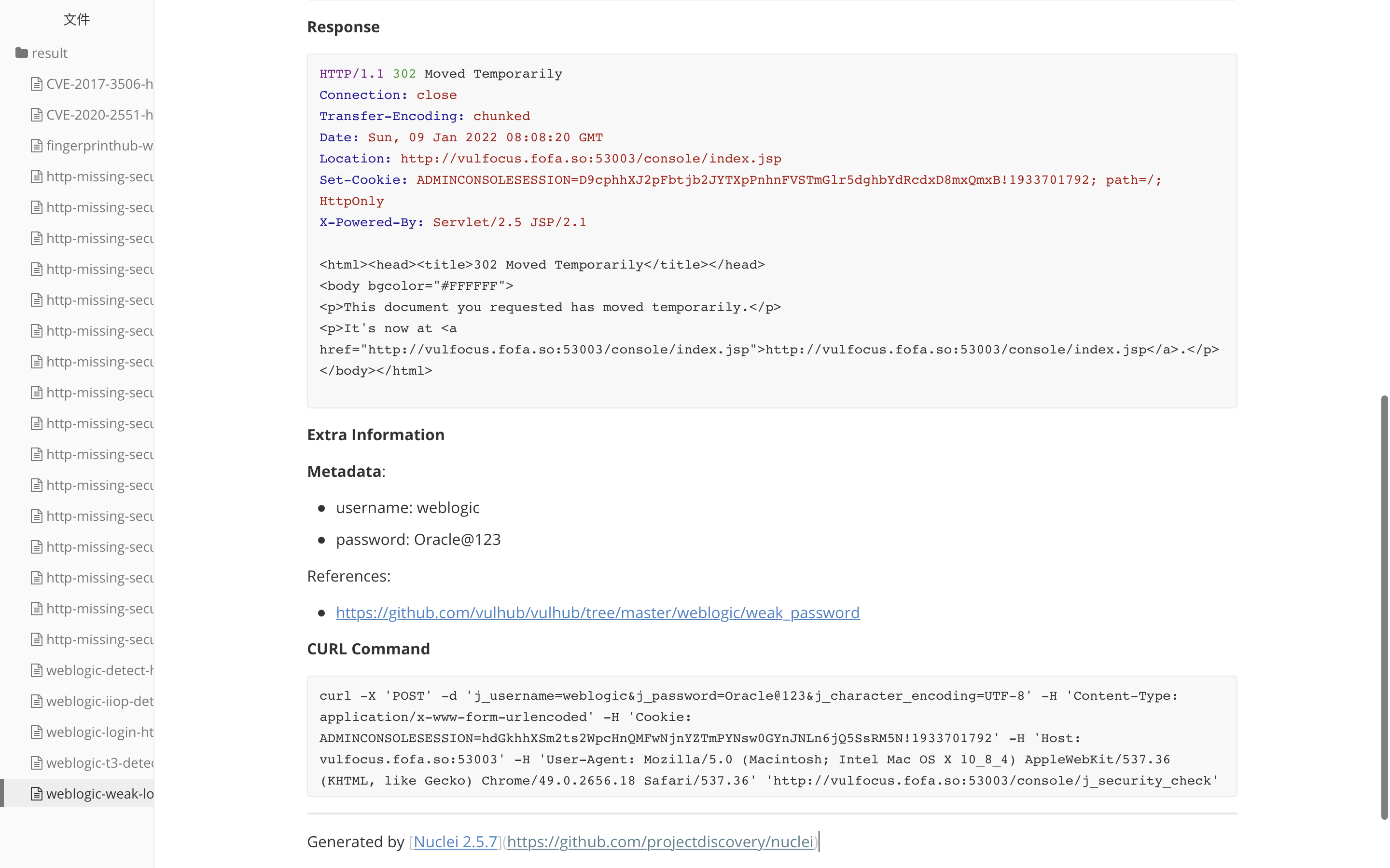 我们使用nuclei -u http://vulfocus.fofa.so:53003 -me result 命令生成Markdown文件