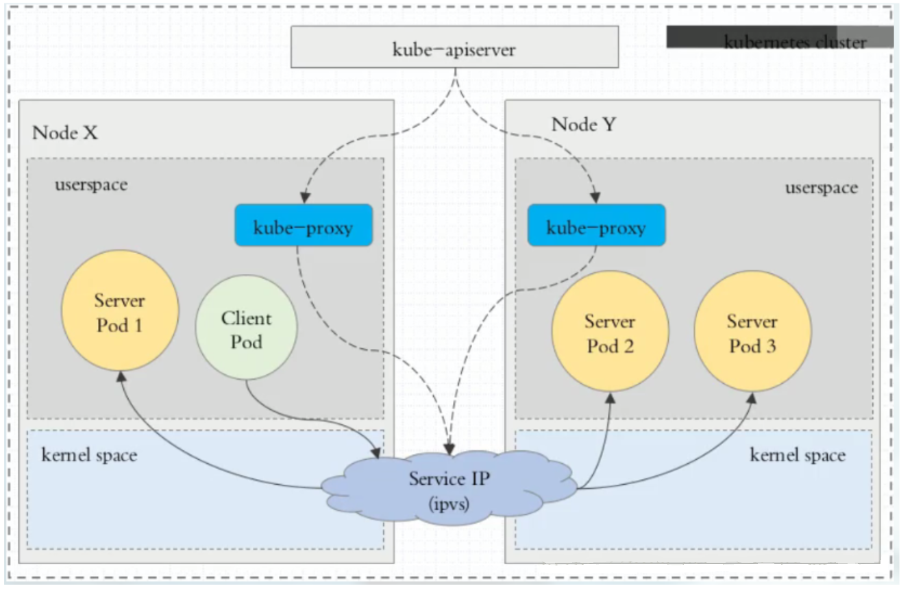ipvs代理模式中 kube-proxy会监视 Kubernetes Service对象和 Endpoints,调用 netlink接口以相应地创建 ipvs规则并定期与 Kubernetes Service对象和 Endpoints对象同步 ipvs规则,以确保 ipvs状态与期望一致。访问服务时,流量将被重定向到其中一个后端 Pod。
