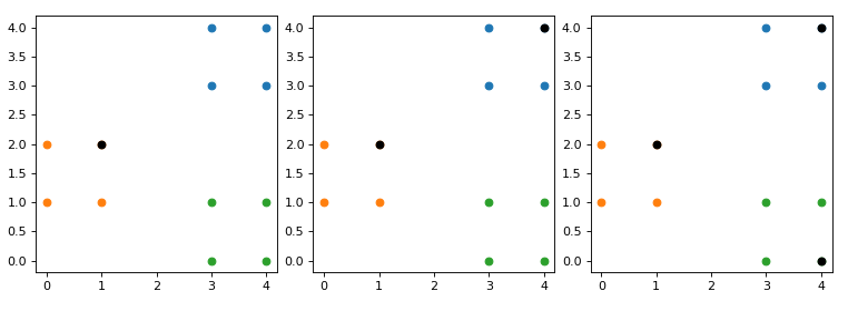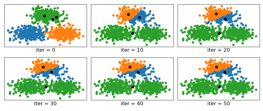 如图所示的数据集仍旧是在上一篇文章中我们所用到的人造数据集,不同的是在进行聚类时我们人为的将三个簇中心初始化了到一个簇中。其中iter=0时的情况为未开始聚类前根据每个样本的真实簇标签所展示的情况,其中蓝色、绿色和橙色分别表示三个簇的分布情况,三个黑色圆点为初始化的簇中心。从上图中可以发现,