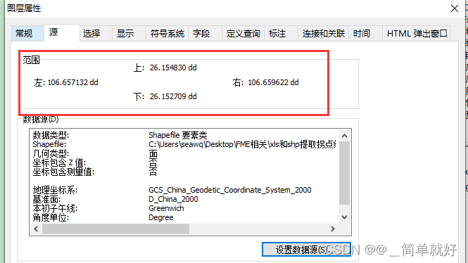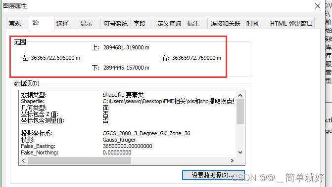 如果我们拿到一个规范的SHP文件,一般是有定义好坐标系的,是投影坐标系或者地理坐标系。如果没有可以定义坐标系,那么可以在ArcMap中加载SHP文件,查看属性里的范围的上、下、左、右来判断是地理坐标还是投影坐标。可以明显看到左右是100+的、上下是几十的那种就是地理坐标了(如图2.1);如果左右的整数部分是8位数,上下的整数部分是7位数,那么就是投影坐标了(如图2.2)。确定坐标类型后做个定义投影即可。