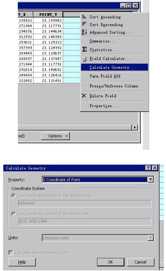 2 右键X字段,选择calculate geometry,如果颜色显示为灰色,不能选择,把数据转换成shape格式
