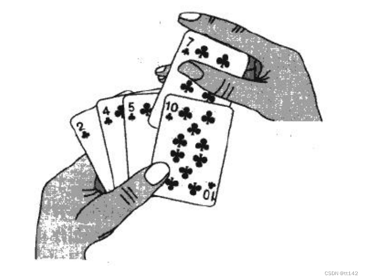 排序肯定不需要多介绍,插入排序就像是打牌的时候边摸排,边理牌,我们想把每个新摸到的手牌都按照顺序或者逆序放到之前的手牌里,这就是插入排序