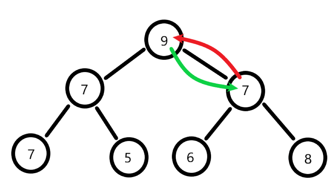 - 第二步:父节点与子节点中较大的数字比较,找出较大值,若父节点较大,则跳出循环。若子节点较大,则父节点和子节点交换。