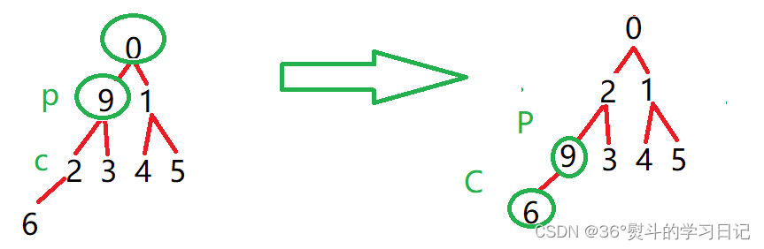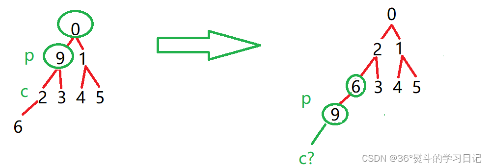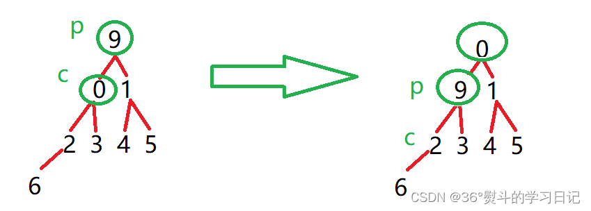 9 为父(根)节点,0,1都是其子节点,0 < 1;所以将0与9作一次交换;父节点同时下移至子节点,子节点变为新父节点的子节点:(p = parent, c = child)