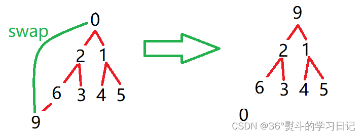 9 为父(根)节点,6 是其子节点,6 < 9;所以将6与9作一次交换;父节点同时下移至子节点,子节点变为新父节点的子节点: