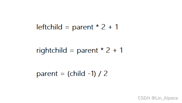 虽然我们画出它的模型是完全二叉树的样子,但实际上堆的数据是存放在一个一维数组里的,不用惊慌,如下三个公式便可以解决我们于堆访问的问题。归根结底还是数学问题。