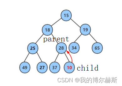 以这课二叉树为例解释一下向上调整算法, 此时的child是最后一个节点10,父节点是28(根据子节点和父节点的关系计算,可以看上一篇文章),28比10大,因为是小堆所以要交换二者的值,并将原来28的位置(即parent)赋给原来10的位置(即child)。然后更新parent的位置到18. 如图二示