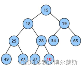 如图三示,如果这时候删除掉15,然后把18,19中的较小值18顶上去成为堆顶元素,那么原本示18的子节点的25和28就不再会是18的子节点了,这个堆的结构发生了改变不便于进行操作。那么可不可以有没有一种不影响原来堆结构并且能成功删除堆顶元素的操作呢?答案当然是有的。