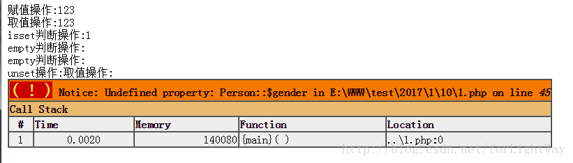 echo 'unset操作:';unset($person->gender);结果如下: