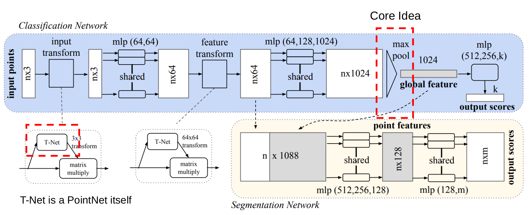 一是在论文表现出来的T-Net网络,通过在网络中添加T-Net子网络进行点云的变换。T-Net网络其实本身就是一个PointNet网络,只不过网络输出的是一个三维的旋转矩阵。当然这部分的作用似乎并不是很大,在后续的一些论文中,这部分已经见不到了。至于为什么作用不大,个人理解是点云的置换不变性质是不是已经包含了旋转的情况那?