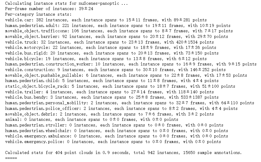 实例统计信息是专属于全景数据集的。为此,我们提供了list_panoptic_instances()函数。你可以将sort_by设置为[‘count’, ‘index’, ‘name’]之一。该函数将计算每帧的实例数,实例总数(唯一的对象ID)和实例状态(一个实例可能有多个状态)。它还计算每个类别的统计数据,包括一个实例跨越的帧数的平均值和标准偏差,以及每个实例的点数的平均值和标准偏差。
