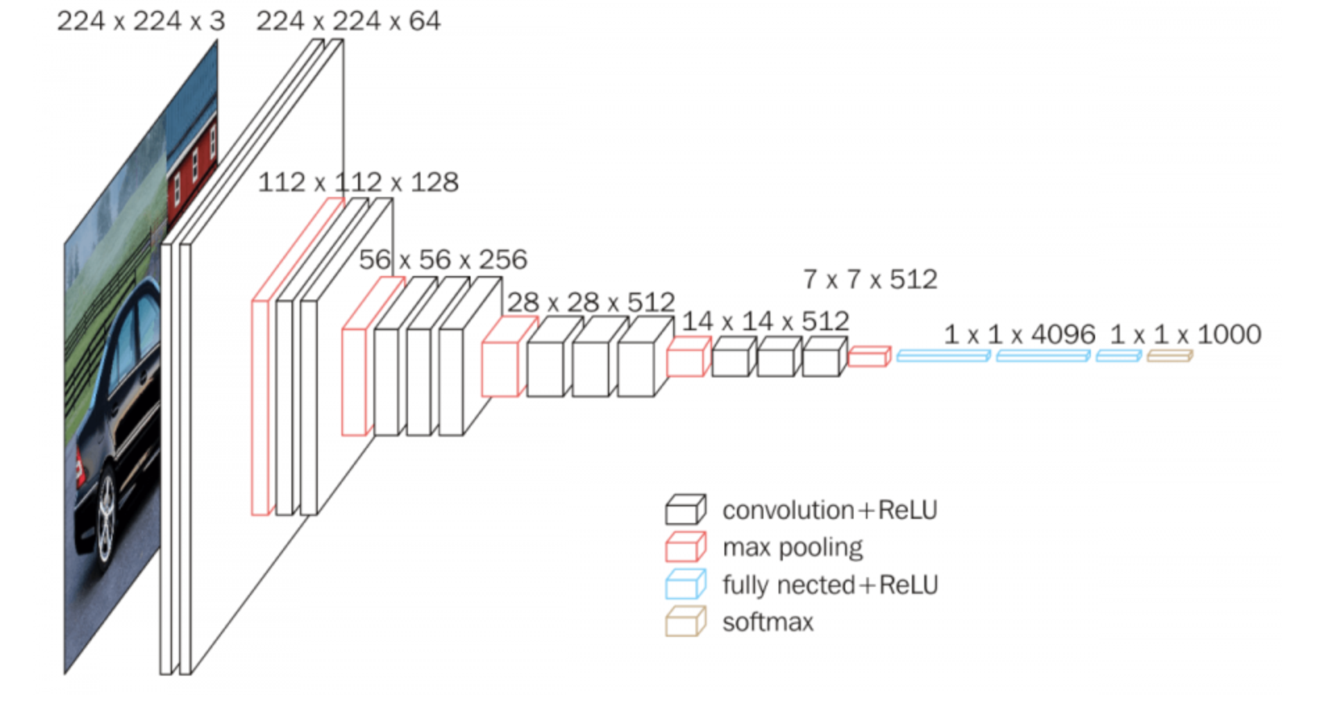 VGG16相比AlexNet的一个改进是采用连续的几个3x3的卷积核代替AlexNet中的较大卷积核(11x11,7x7,5x5)。对于给定的感受野(与输出有关的输入图片的局部大小),采用堆积的小卷积核是优于采用大的卷积核,因为多层非线性层可以增加网络深度来保证学习更复杂的模式,而且代价还比较小(参数更少)。