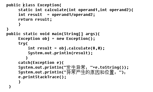这里的e表示产生的异常对象,通过toString()方法可以获得产生异常的原因,用printStackTrace()方法可以获得产生异常的原因及其位置。