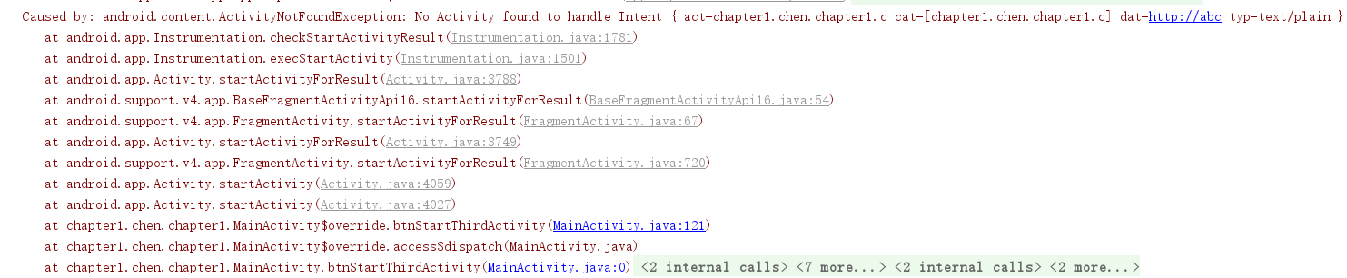还记得schema是有默认值的吗?如果把上面的intent.setDataAndType(Uri.parse("file://abc"), "text.plain")这句改成intent.setDataAndType(Uri.parse("http://abc"), "text.plain"),打开Activity就会报错,提示无法找到Activity,如下图所示.另外一点,Intent-filter的匹配规则对于Service和BroadcastReceiver也是同样的道理,不过系统对于Service的建议是尽量使用显示调用方式来启动服务.