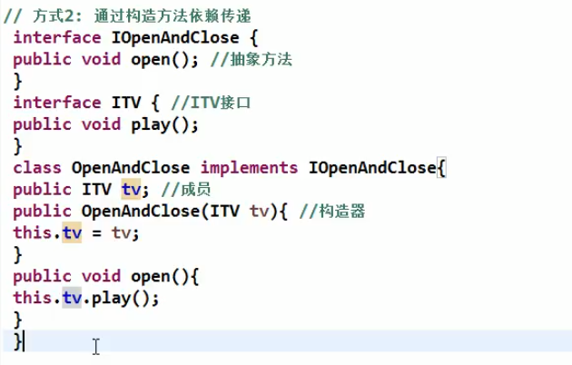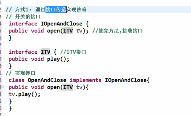 模块间的依赖通过抽象发生,实现类之间不发生直接的依赖关系,其依赖关系是通过接口或抽象类产生的 接口或抽象类不依赖于实现类 实现类依赖于接口或抽象类 更为精简的定义:面向接口编程(Object-Oriented Design, OOD)