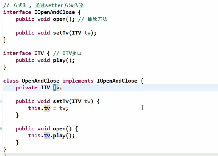 每一个逻辑的实现都是由原子逻辑组成的,不可分割的原子逻辑就是低层模块(一般是接口,抽象类),原子逻辑的组装就是高层模块。在Java语言中,抽象就是指接口和或抽象类,两者都不能被直接实例化。细节就是实现类,实现接口或继承抽象类而产生的类就是细节,可以被直接实例化。下面是依赖倒置原则在Java语言中的表现: