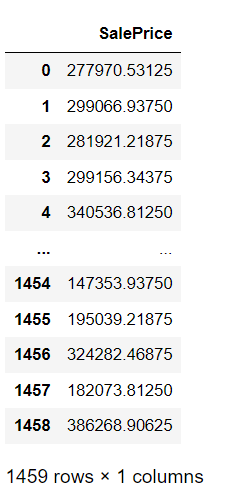 newdf = newdf.append({'SalePrice' : k[0]},ignore_index=True)