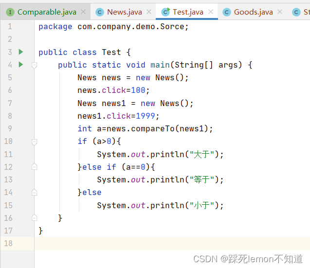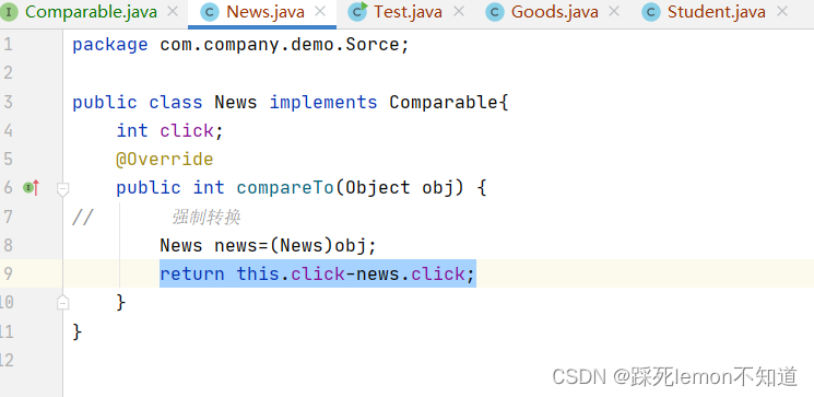 因为在int compareTo(Object obj);方法中,返回值是int类型,所以我们可以直接用两个新闻的点击数的差来判断,大于0时,返回大于,小于0时返回小于,等于0时返回等于。