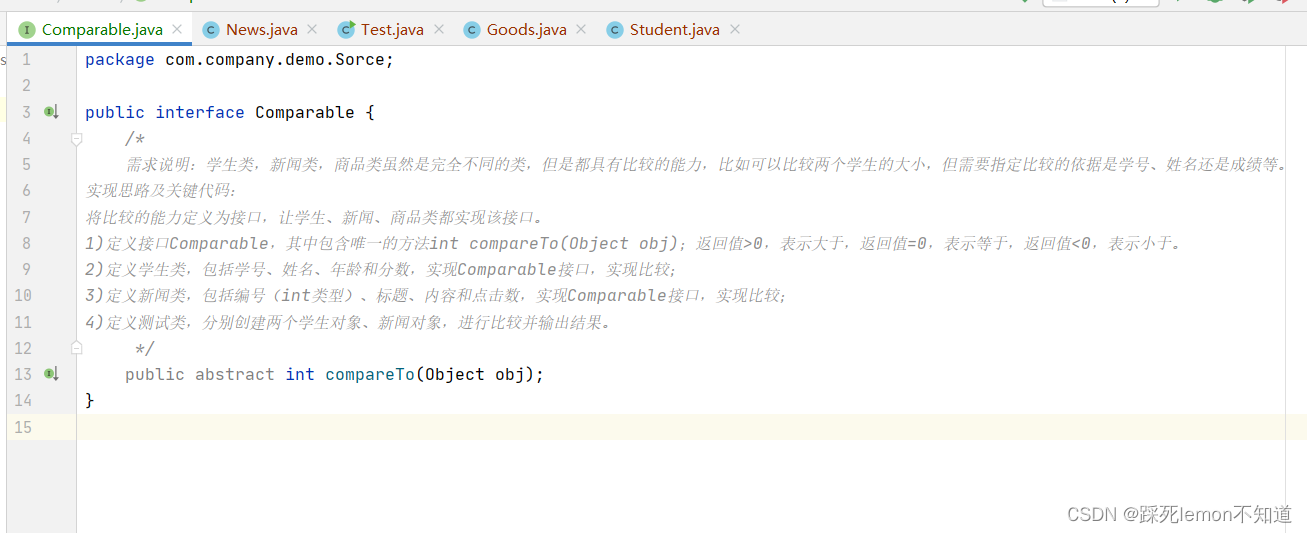 根据题意,我们可以看出,需要定义一个接口(Comparable),三个类(Student、News、Goods),接口包括唯一的方法int compareTo(Object obj);通过方法判断返回值的类型,如果返回值>0,表示大于,返回值=0,表示等于,返回值<0,表示小于。