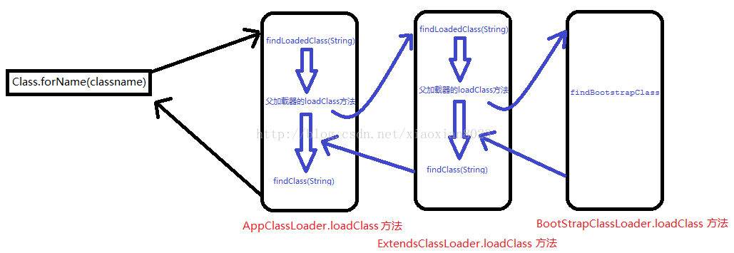 在forName方法中,调用了ClassLoader.loadClass方法来完成类的反射。根据类加载器的特殊性,结合我的调试过程,画了一个简单的流程图,