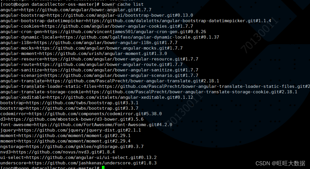找到datacollector-oss-master/datacollector-ui文件夹里面的bower.json文件,使用bower install 命令将里面的包一个一个下载到本地,bower install的时候需要开启vpn,因为一些git网址被墙了,很坑,如果install失败就多尝试几次。都安装完成之后bower cache list查看下本地的缓存列表,可以看到包都被缓存起来了