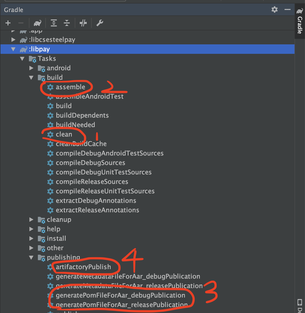 在AS中点击右侧边栏Gradle选项卡选择要发布的Module(libpay)