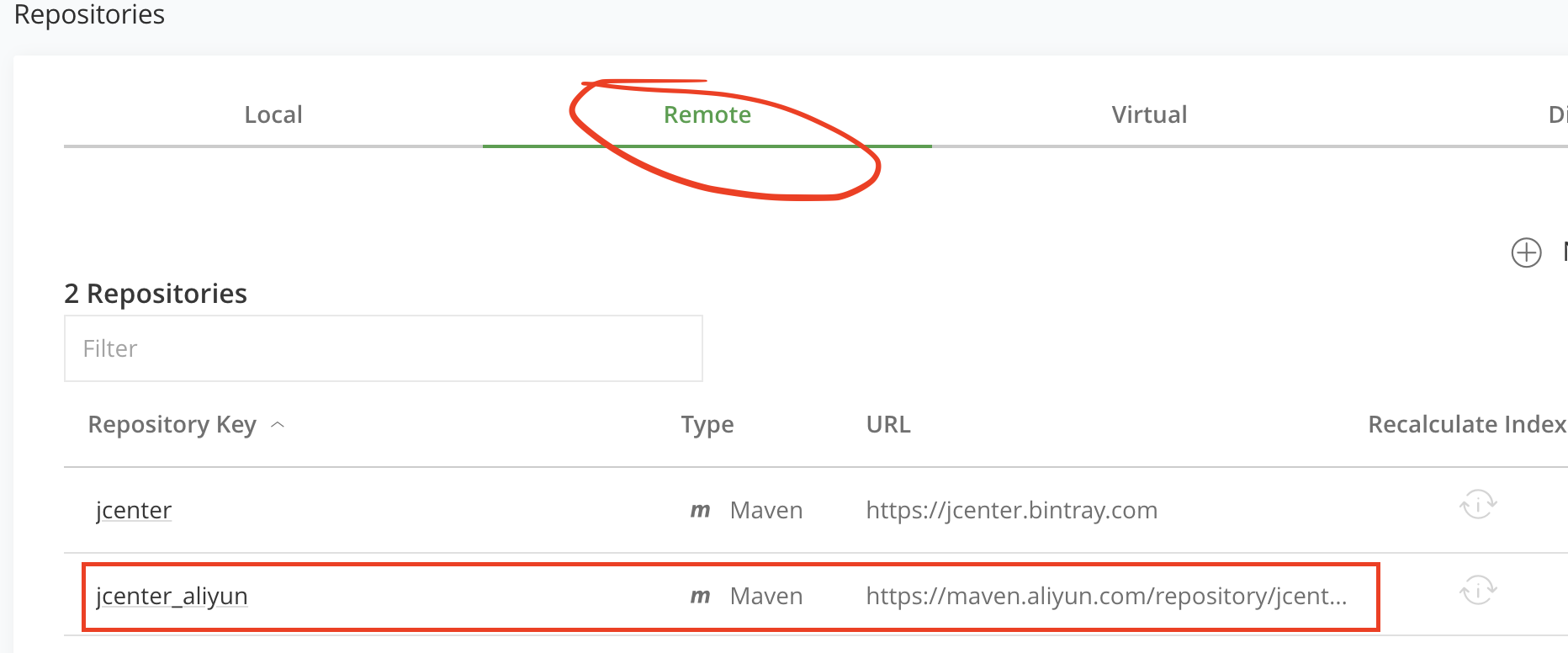 jcenter_aliyun远程仓库,首先,点击右上角的New Remote Repository选择仓库的类型,填写仓库Key,以及依赖阿里云的Jcenter仓库地址