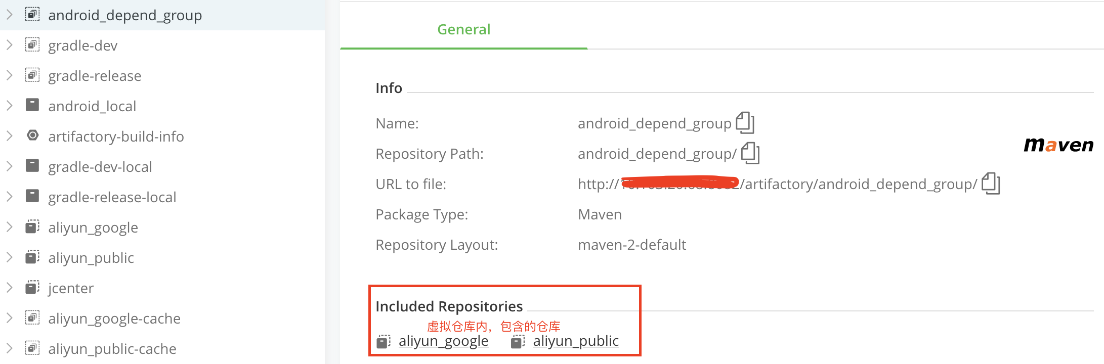 返回到仓库列表可查看到们创建好的虚拟仓库(android_depend_group),可见其内部包含了哪些具体的仓库