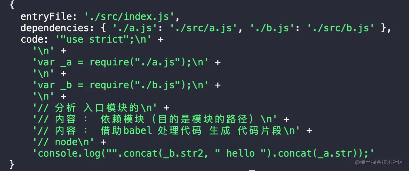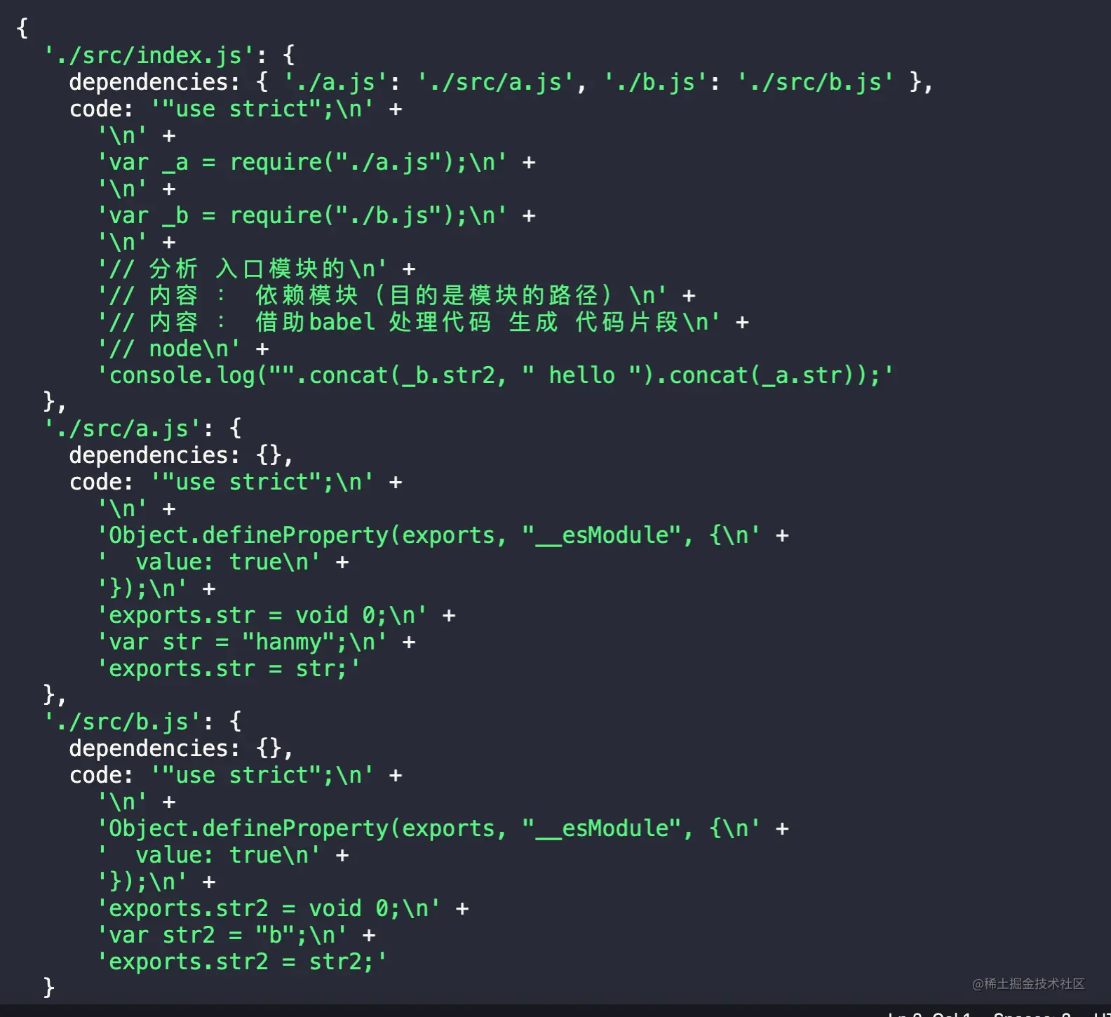 })({"./src/index.js":{"dependencies":{"./a.js":"./src/a.js","./b.js":"./src/b.js"},"code":""use strict";nnvar _a = require("./a.js");nnvar _b = require("./b.js");nn// 分析 入口模块的n// 内容 : 依赖模块(目的是模块的路径)n// 内容 : 借助babel 处理代码 生成 代码片段n// nodenconsole.log("".concat(_b.str2, " hello ").concat(_a.str));"},"./src/a.js":{"dependencies":{},"code":""use strict";nnObject.defineProperty(exports, "__esModule", {n value: truen});nexports.str = void 0;nvar str = "a";nexports.str = str;"},"./src/b.js":{"dependencies":{},"code":""use strict";nnObject.defineProperty(exports, "__esModule", {n value: truen});nexports.str2 = void 0;nvar str2 = "b";nexports.str2 = str2;"}})