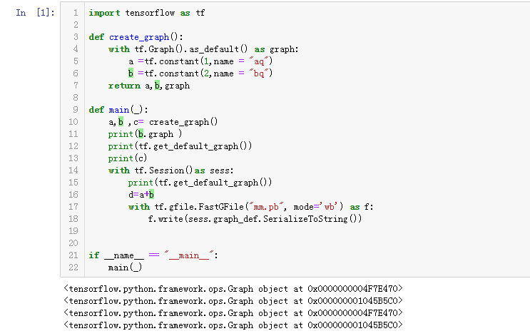 从上边代码执行结果来看,create_graph()创建的图与main()中的默认图是不一样的,结论一:如果session会话中没有指定图参数,那么系统会将自动维护一个默认图,如果修改tf.Session(graph = c),把第三个print(c)删掉,在会话范围外打印默认图,那么执行的结果为