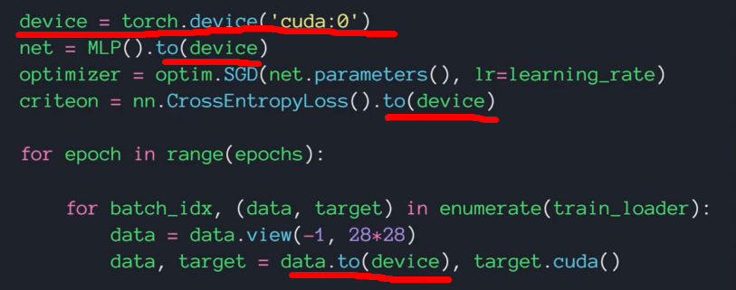 把计算过程从CPU切换到GPU上。首先,把设备定义为使用cuda,然后把我们建立好的网络MLP搬到设备上去,还需要把交叉熵损失函数也搬上去,最后需要把data搬上去。,即完成了数据上传至cuda进行加速运算的前期准备。