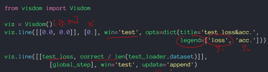 比如说先创建一个可视化表:viz.line([[y轴第一个参数,y轴第二个参数]][x轴参数],标签分别为loss和acc)