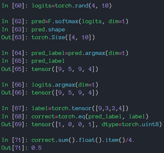 - 当然,即时不使用softmax函数进行归一化,也不影响预测标签的结果。这里直接从假设的logits输出的预测标签与使用softmax函数一致,也为[9,5,9,4]。