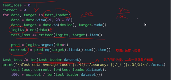 这里每个epoch进行一次准确率的计算。Correct表示预测正确的图片数量,len(test_loader.dataset)表示总的图片数量,二者一除就是正确率。