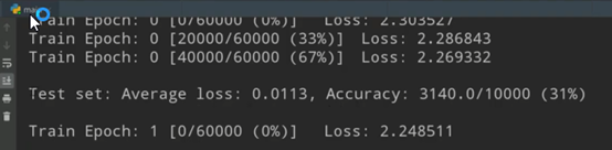 当一轮epoch结束后,进行测试,报告测试集的平均loss为0.01,准确率为3140/10000,为31%。