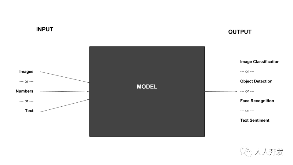 那么机器学习和深度学习如何运作?为了以最简单的方式解释它,你基本上有一个定义输入的模型(可以是图像,音频,数字或文本)。该模型将根据所接收的输入数据产生特定输出(例如,图像分类,检测到的对象等)。