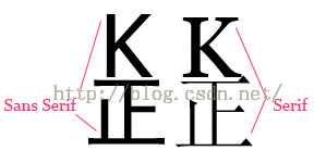 Serif的意思是,在字的笔划开始及结束的地方有额外的装饰,而且笔划的粗细会因直横的不同而有不同。相反的,Sans Serif则没有这些额外的装饰,笔划粗细大致差不多。如下图: