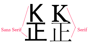 Serif的意思是,在字的笔画开始及結束的地方有额外的装饰,而且笔画的粗细会因直橫的不同而有不同。相反的,Sans Serif则沒有这些额外的装饰,笔画粗细大致差不多。如下图: